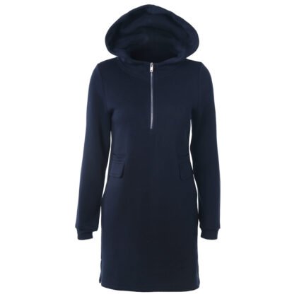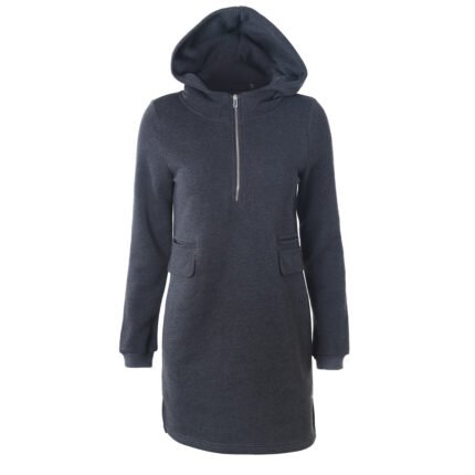 Autumn Winter Neckline Zipper Hooded Pullover Faux Pocket Solid Color Women