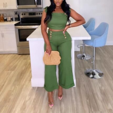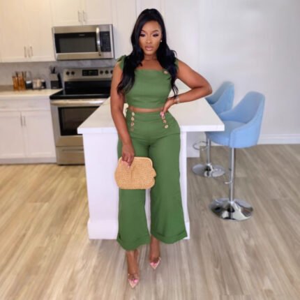 Elegant Office Strap Smocking Slim Fit Wide Legged Pants Two Piece Set