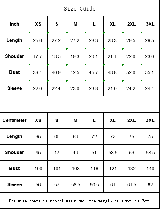 The size chart is manual measured, the margin of error is 3cm.