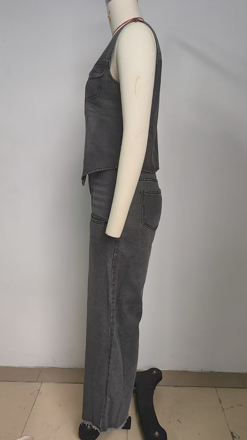 Autumn Washed Denim Waistcoat Vest Slimming Denim Pants Two Piece Set
